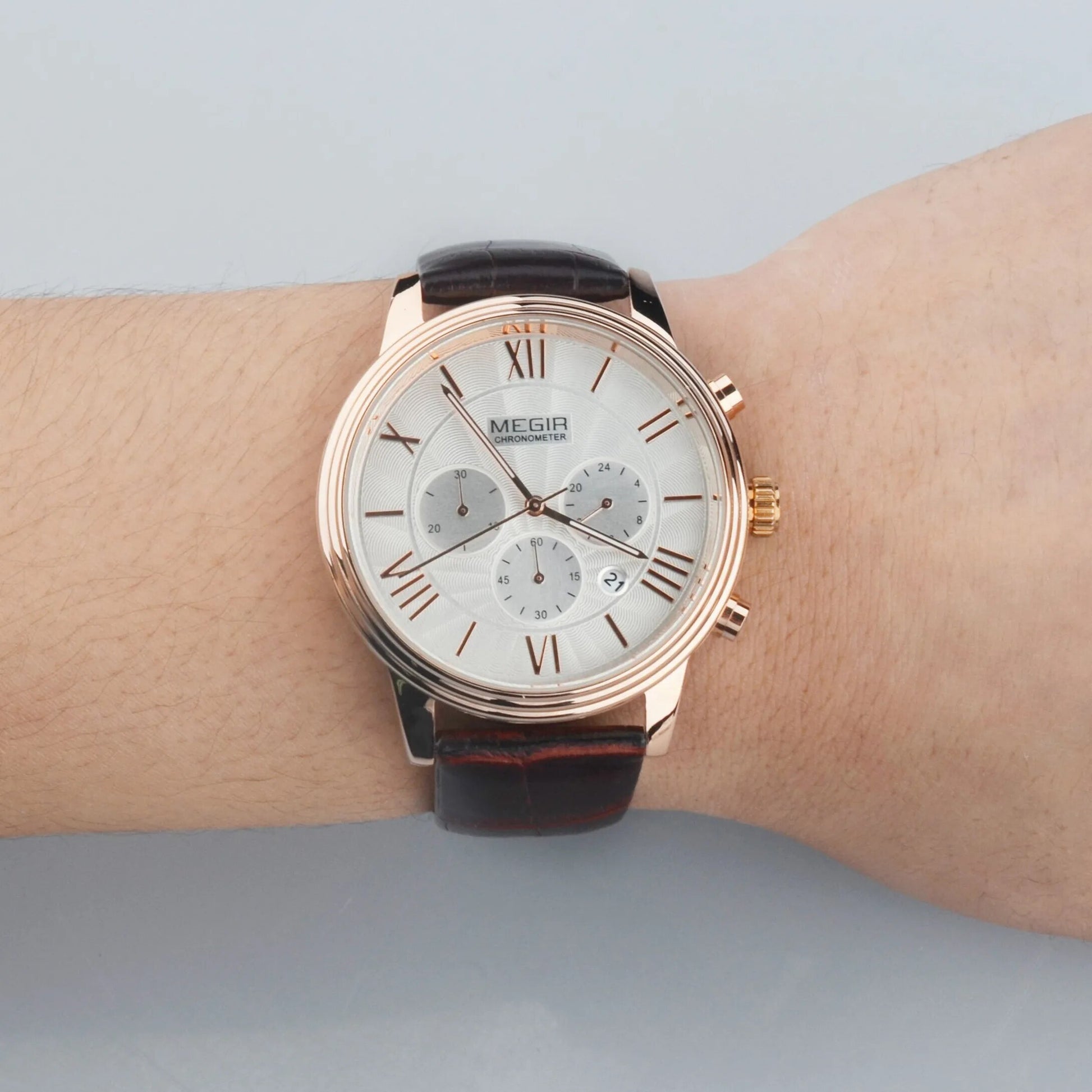 MEGIR Brown Retro Sports Quartz Men's Watches Large Dial Chronograph Clock Fashion Multifunctional Men Wrist Watch Montre Homme